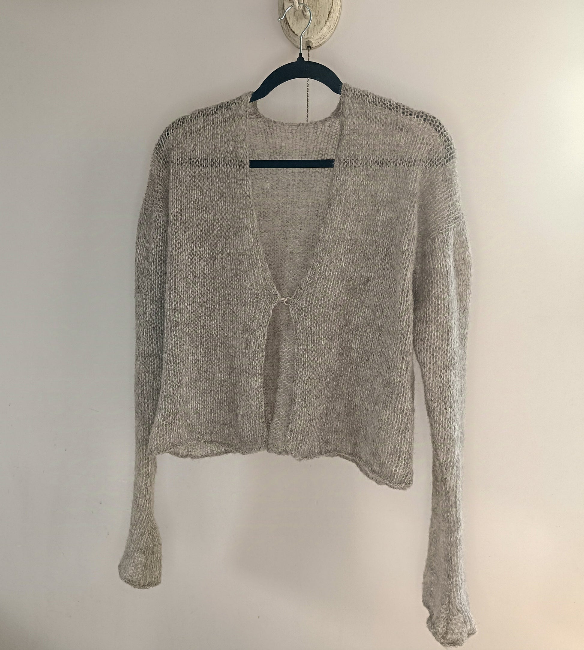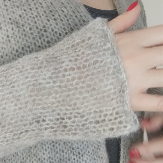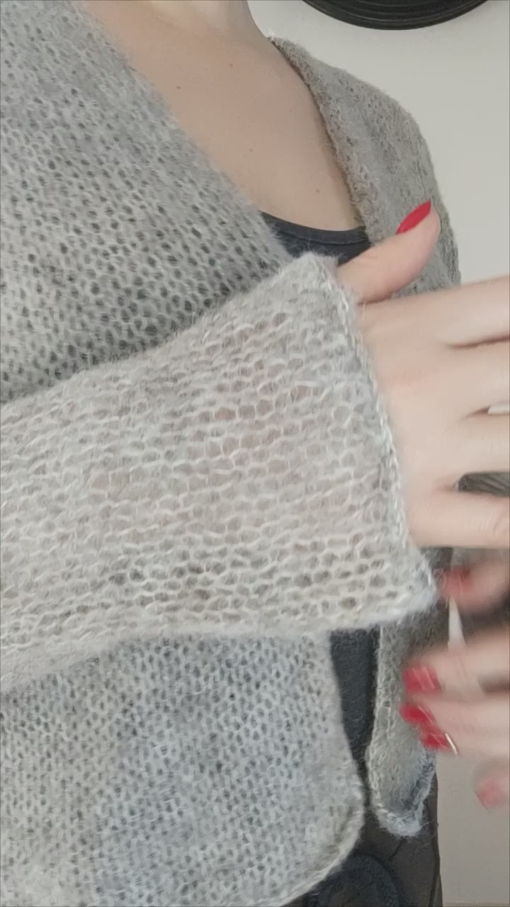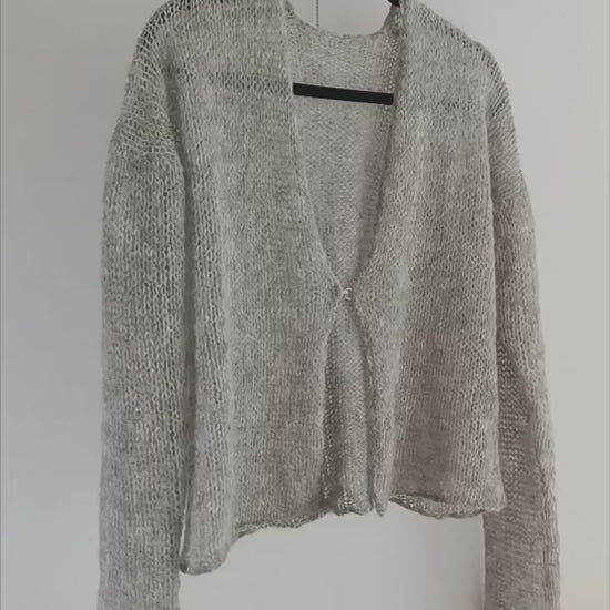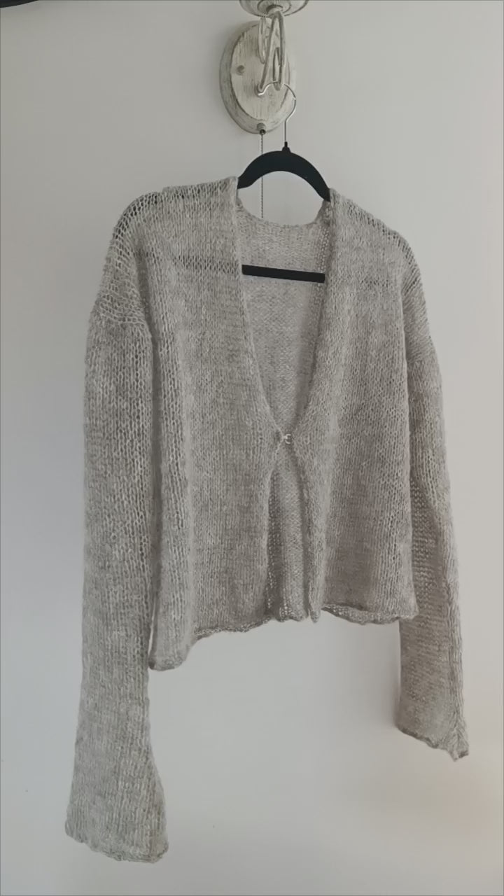 Soft gray open-front cardigan crafted from a luxurious alpaca and silk yarn blend. Lightweight yet warm, with a smooth, elegant drape and a discreet hook and eye closure. This handmade knitwear piece offers refined comfort, making it ideal for layering in both everyday and elevated wardrobes.