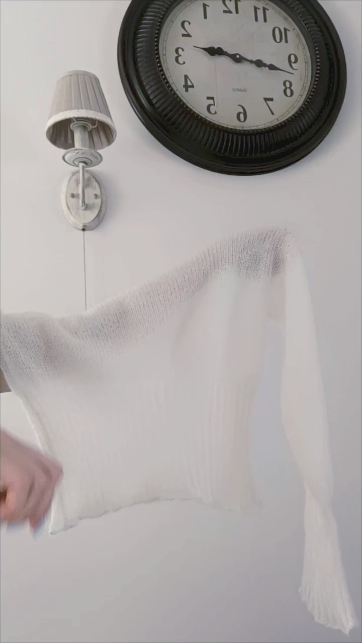 Made to order White Mohair Silk Sweater: Balloon Tie Sleeves, Ribbed Waist