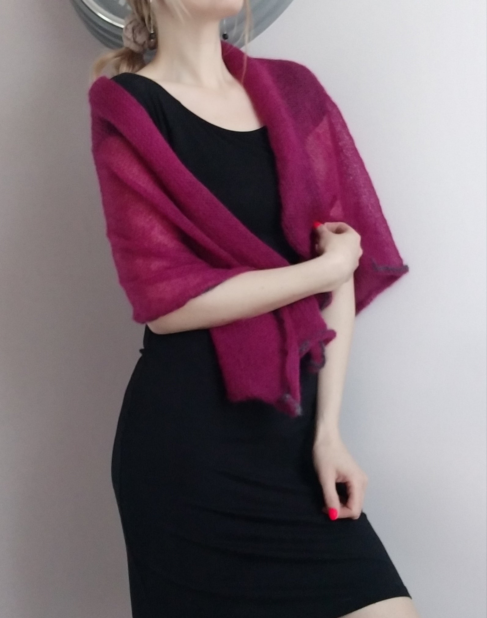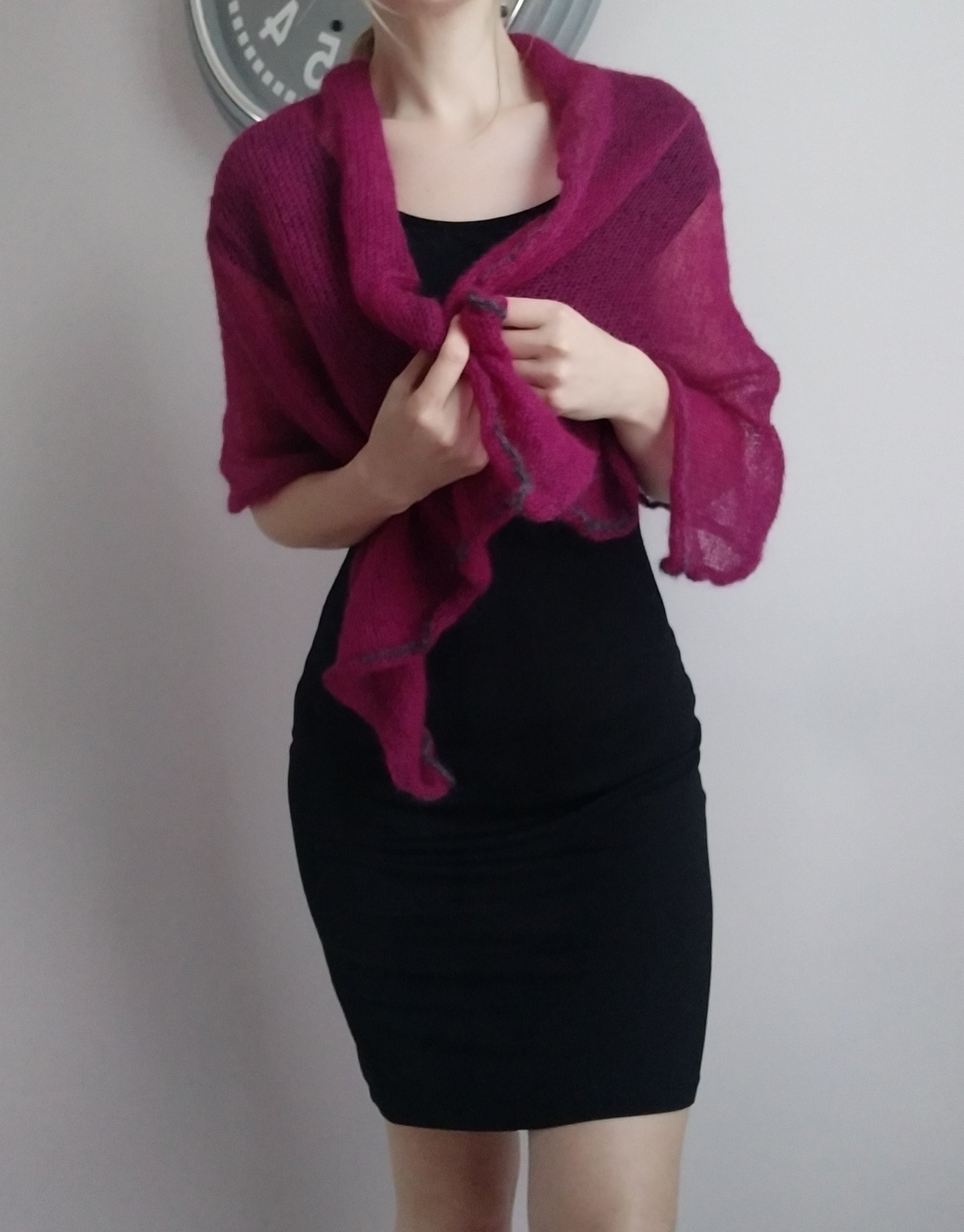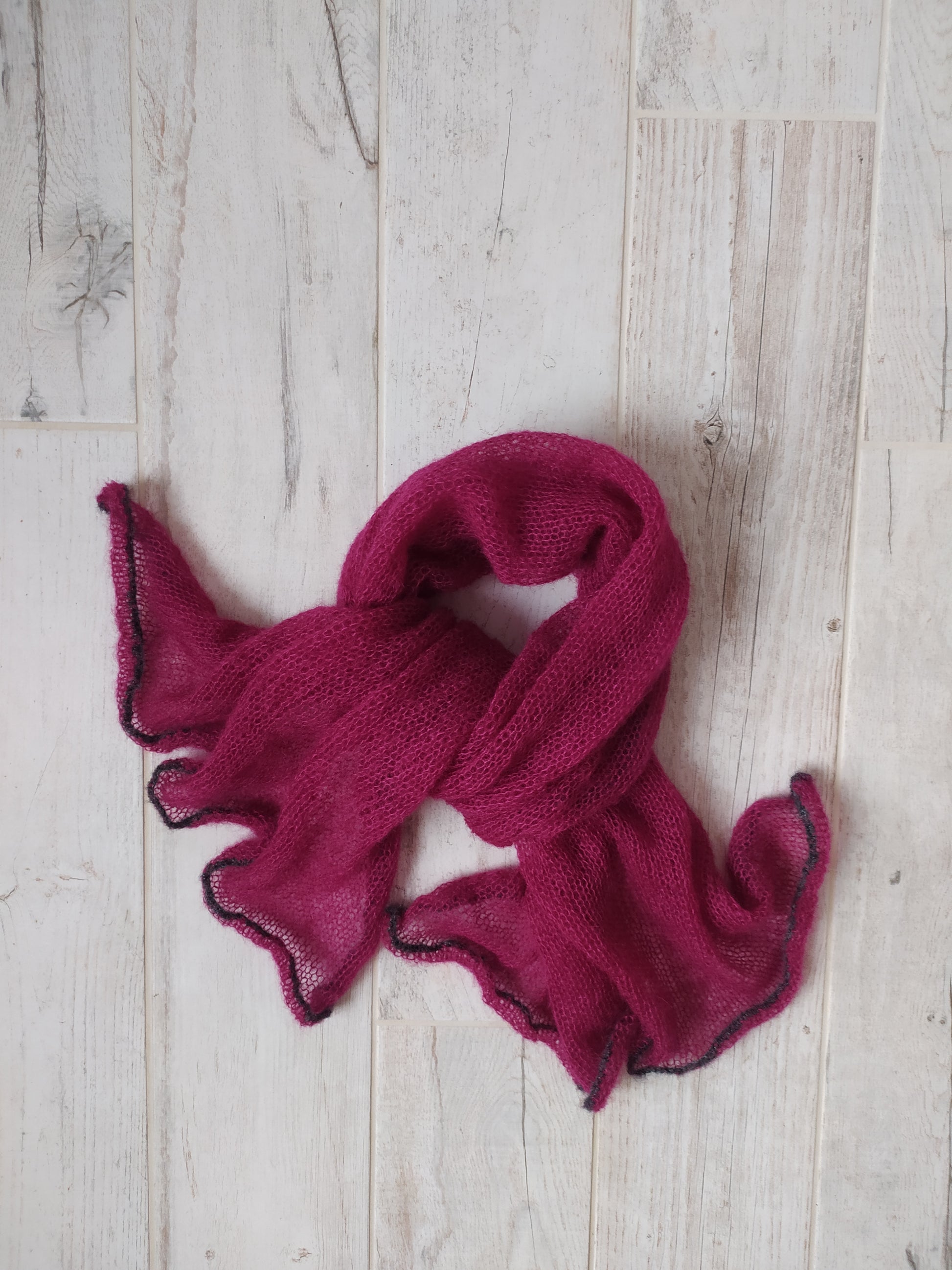 Soft and light-weight mohair. Burgundy color with dark gray decorative edge. This transparent elegant shawl is suitable for every day and for going out. Long and wide, but it takes up so little space in your handbag! Mohair yarn is breathable to keep you warm in winter and cool in summer.