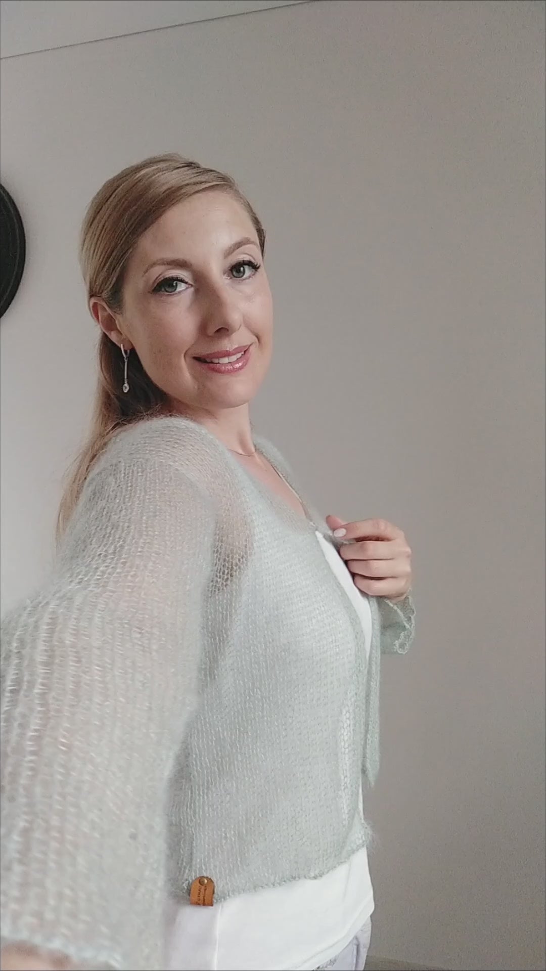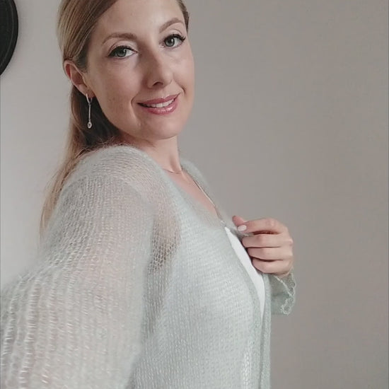 Sheer knitwear, a lightweight knit cardigan and an elegant layering piece. Made from soft mohair and silk yarn, safe for your skin (Oeko-Tex® certified). Breathable and light for a cool, windy summer day, yet warm and cozy in winter without feeling bulky. Features and easy hook-and-eye closure. Handmade in Lithuania and ready to ship.