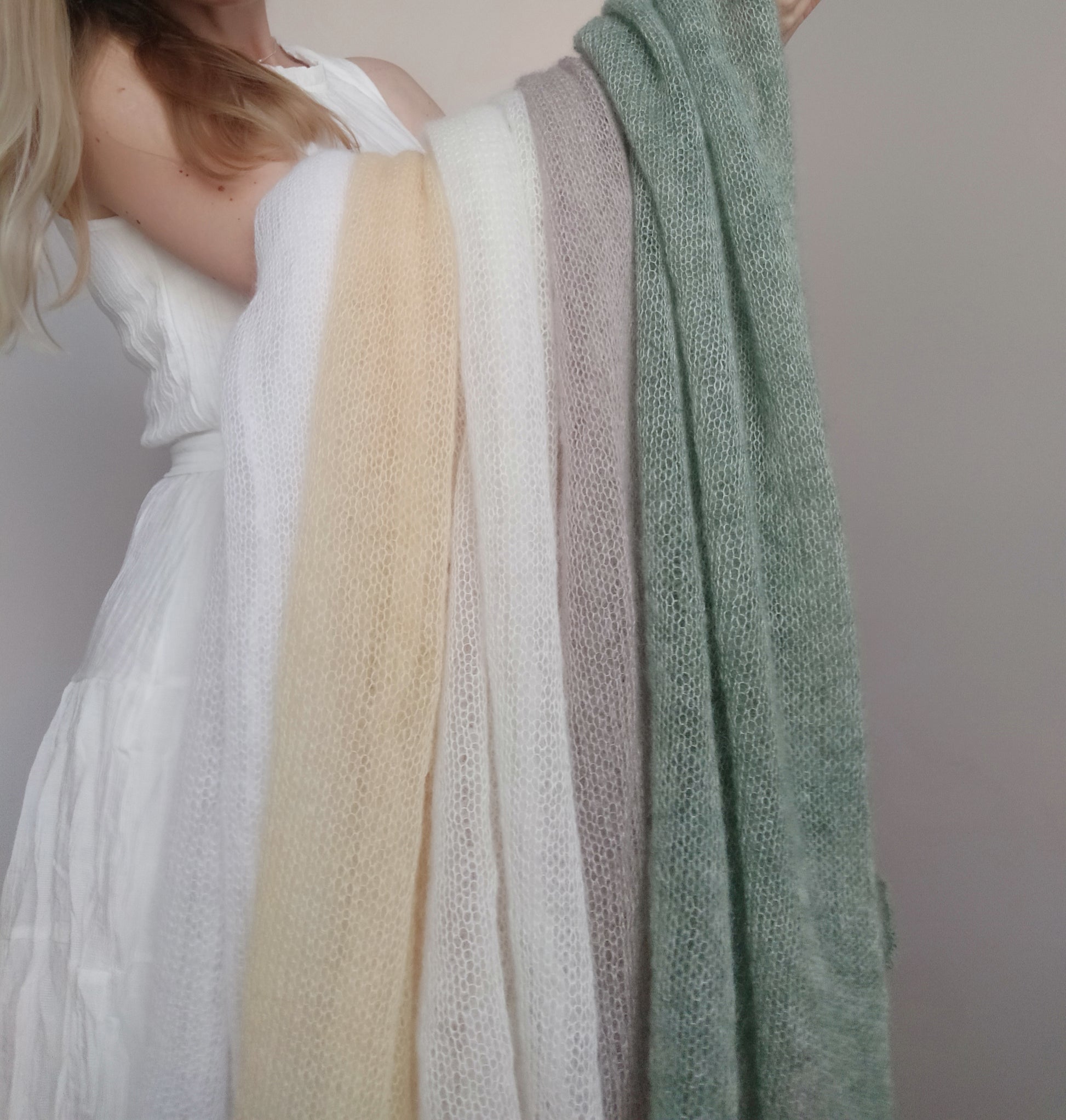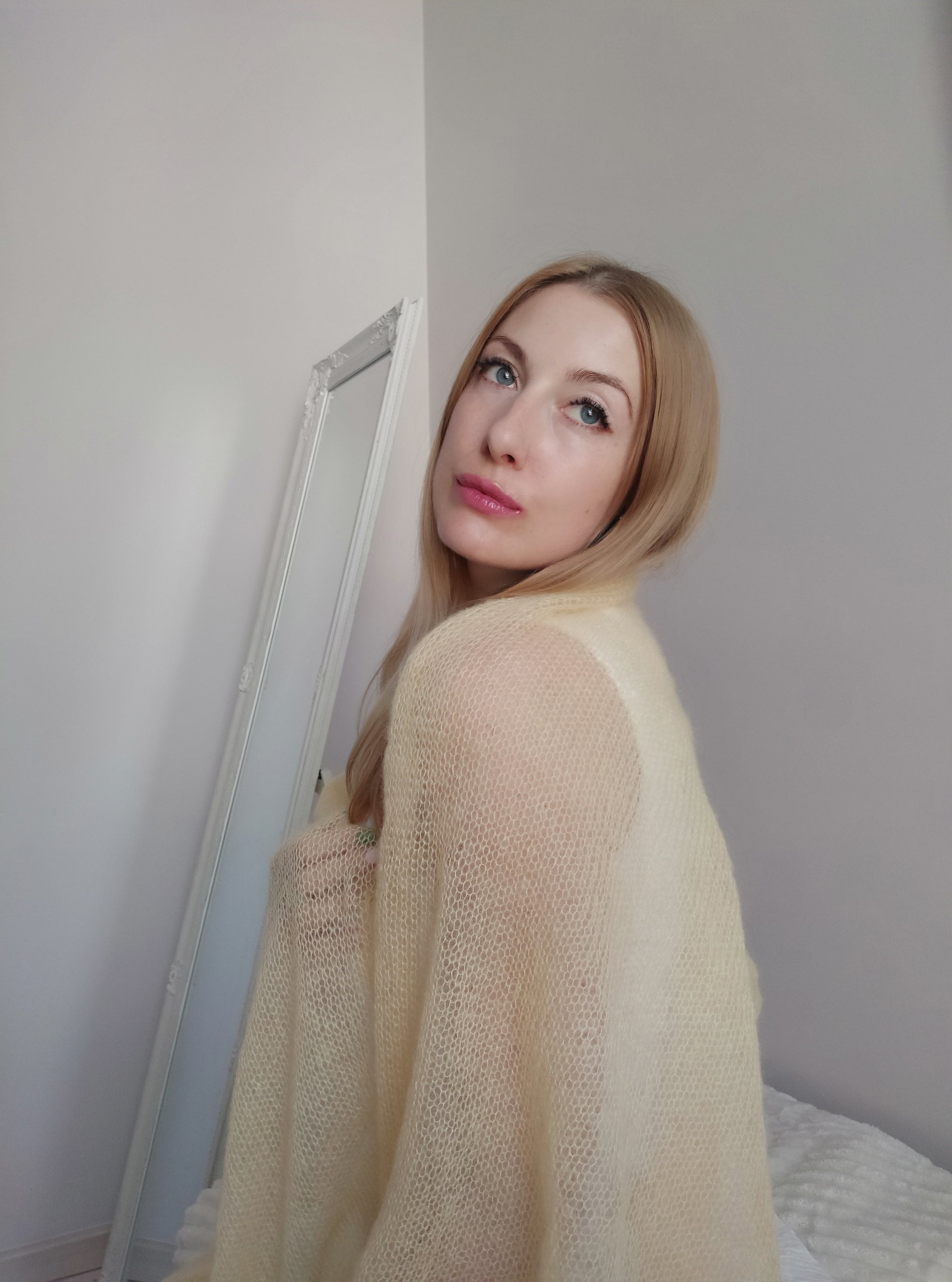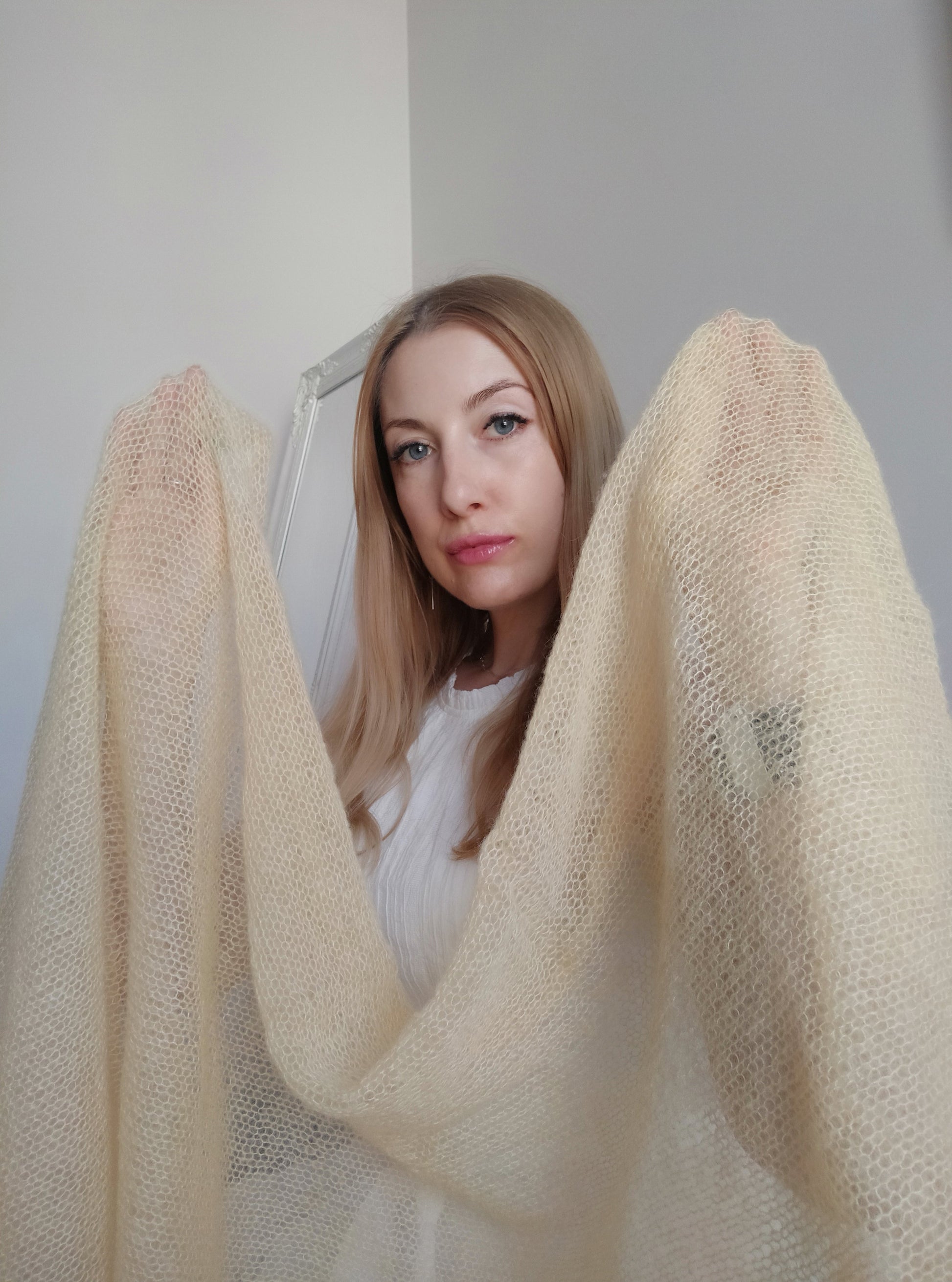 Safe for your skin (Oeko-Tex® certification), soft and light-weight mohair and silk yarn. Handmade in Lithuania and ready to ship. Breathable to keep you warm in winter and cool in summer. Transparent elegant shawl is suitable for every day and for going out.