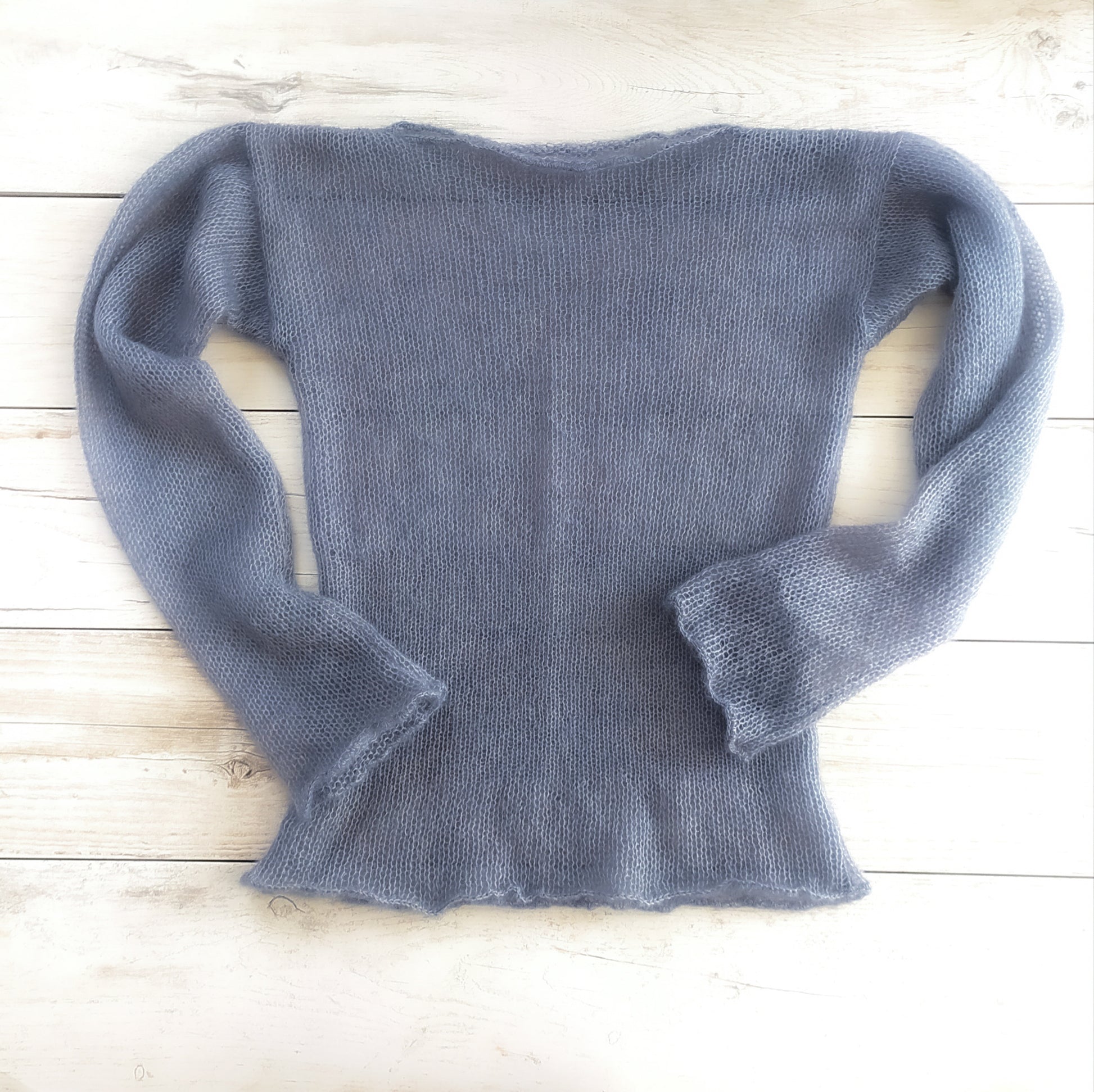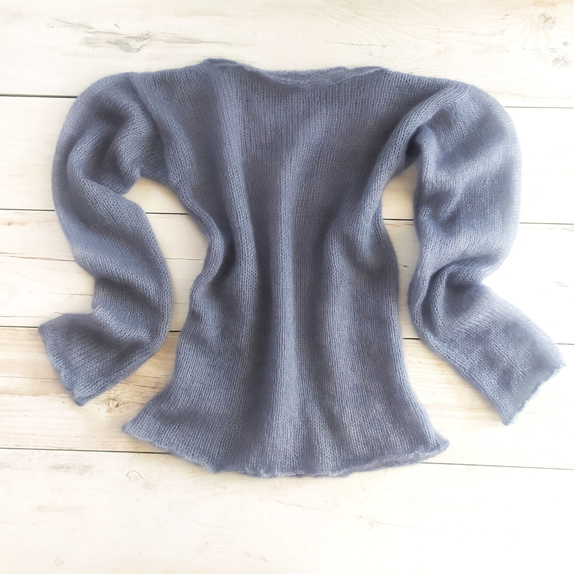 Grey Mohair Silk Sweater: Fitted Lightweight Knit Top XS-S-M
