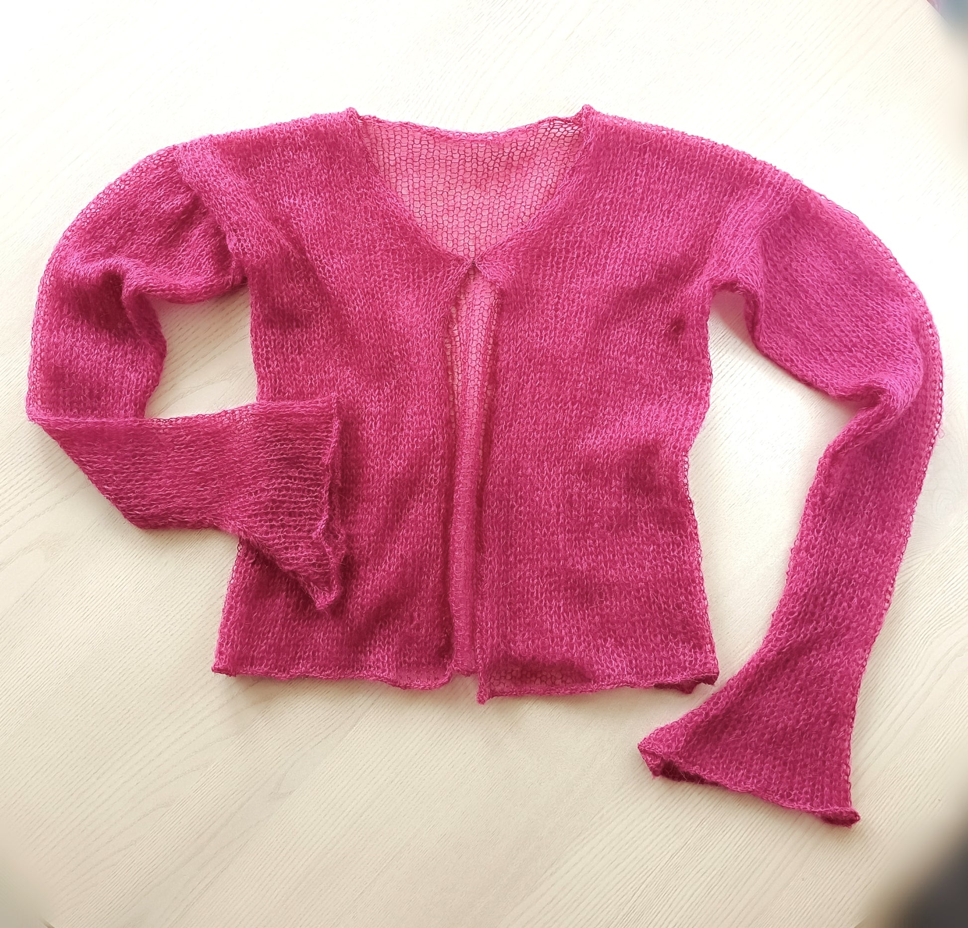 Sheer knitwear, a lightweight knit cardigan and an elegant layering piece. Soft Italian yarn made from 30% kid mohair, 40% acrylic, and 30% polyamide. Light, fluffy, and warm, yet durable and easy to care for. Features and easy hook-and-eye closure. Handmade in Lithuania and ready to ship.